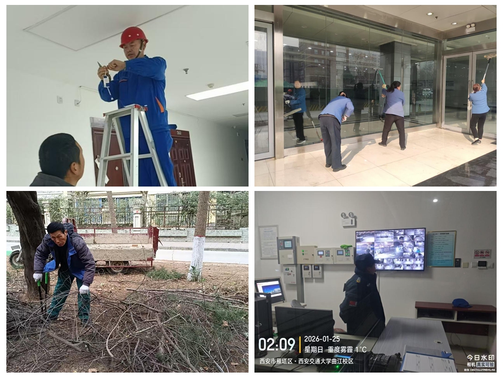 修剪兴庆校区及家属区内乔木528株;对东区浴室门口女贞树进行拦头修剪30余株;大门悬挂春节装饰灯笼;做好绿化植物的病虫害预防工作,完成校园主干道道路冲洗和基础设施清扫保洁。社区与物业服务部持续办理2026年度交大兴庆家属区车辆通行授权;加强兴庆家属区门禁管理、重点区域巡逻等工作;针对交大兴庆家属区重点公共区域和楼宇消防安全等进行安全排查;对家属区电梯设备、立体车库设施和道闸监控维护、外环境和楼宇保洁等工作加强巡查;各大门处挂大红灯笼、灯杆挂中国结;严格执行禁止销售燃放烟花爆竹要求。