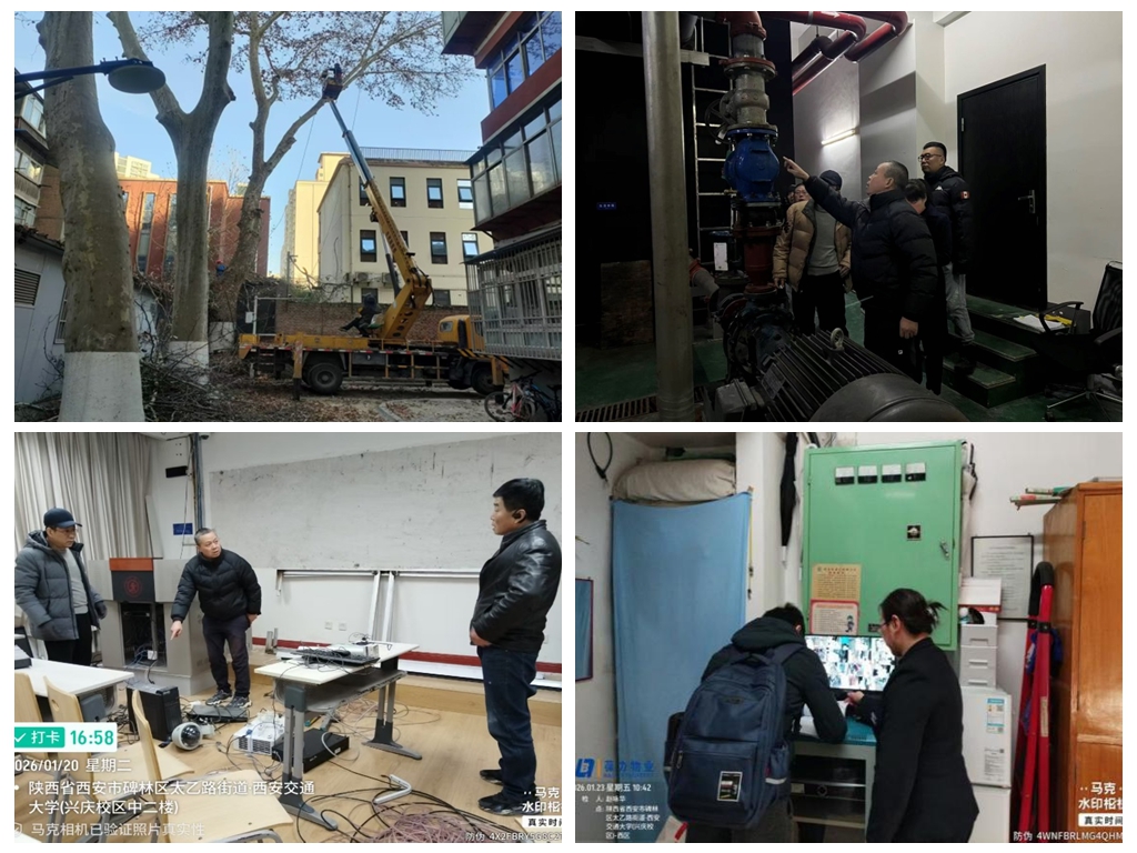 曲江校区管理办公室严格落实学校寒假工作部署要求,全面启动假期服务保障机制,做好安全巡查排查、设施设备巡检、环境整治、应急值守部署、冬季植被绿化养护等重点工作,确保校内各类设施设备运行正常,校区运行平稳有序。筑牢安全防控体系,守好校园第一道防线:出入管理规范化,严格执行门岗24小时值守制度;全域巡查无死角,采用定点值守与动态巡逻相结合模式联防联治;消防设施全检测,配合消防维保单位对校区消防系统开展排查。检修设施设备,保障运行稳定:加大校区水电暖设施巡检力度,每天定时对配电室、水泵房、锅炉房等重点部位进行巡查,及时发现并处理各类故障隐患; 应急保障提前部署,完善雨雪、寒流天气预案,确保应急物资充足到位。推进环境整治,营造洁净校园氛围:冲洗门厅、地垫,对公共区域死角做好清洁,保持校园环境整洁。服务留校师生,全力暖心护航:快速响应师生咨询、报修等事项;生活服务有保障:供暖、浴室、开水正常运行,购电充值正常进行。绿化养护工作,清理景园和西二楼北花园道路积雪,清理绿化区落叶,整形修剪西五楼北侧树木,保持区域整洁美观。