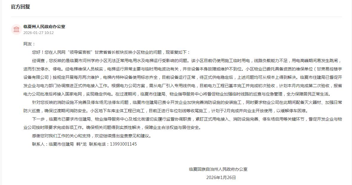 收到留言后,临夏州人民政府办公室迅速核查处置,对相关问题作出回复:“经调查,您反映的是临夏市河州学府小区无法正常用电用水及电梯运行受影响的问题。该小区目前仍使用施工临时用电,线路负载能力不足,用电高峰期间易发生跳闸,进而引发停水、停电。经电梯维保人员核实,电梯运行异常主要与临时用电波动有关,并非设备本身故障或维护不到位。小区物业已委托具备资质的维保单位按规定开展每月两次维护,电梯内特种设备使用标志齐全,目前设备运行正常,待正式供电稳定后,上述问题均可从根本上得到解决。临夏市住建局已督促开发企业与电力部门协调推进正式供电接入工作。根据电力公司方案,需从电厂引入专用线供电,目前电力工程已基本完工并完成初次验收,计划2026年1月内完成第二次验收,报省电力公司批准后将接入国家电网,实现稳定供电。在过渡期间,临夏市住建局、物业指导服务中心将督促物业加强临时线路的巡查与应急管理,全力保障居民正常生活。”