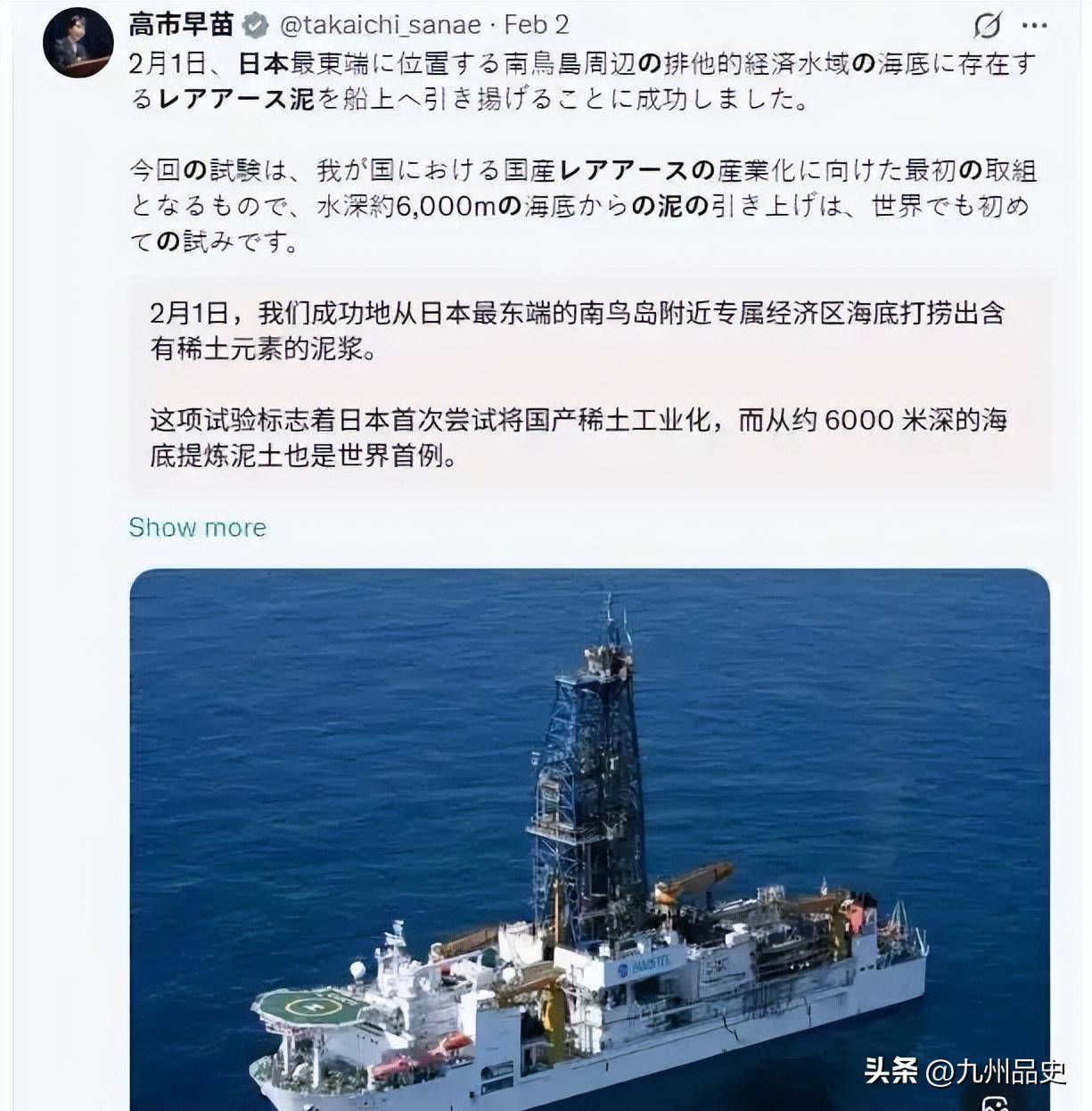 就在这个节骨眼上,高市早苗政府打出了南鸟岛牌。2026年1月12日,日本深海探测船地球号从静冈县清水港出发,浩浩荡荡开往距东京近2000公里的南鸟岛海域。任务听起来很酷——在6000米深的海底挖稀土泥,号称全球首例。日本媒体的镜头对准了这艘全长超过200米、钻井塔高70米的庞然大物,仪式感拉满。高市早苗更是在竞选演说中暗示日本已经找到了稀土问题的解决方案。