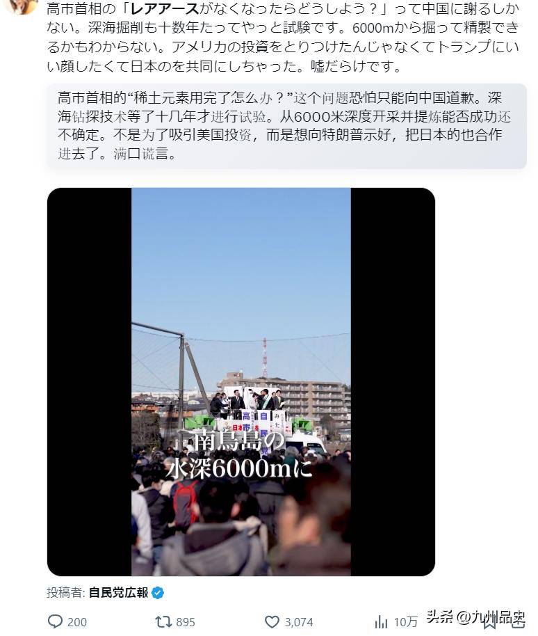 日本在外交上因为高市早苗的激进路线陷入被动,稀土供应面临前所未有的压力,产业界人心惶惶。这个时候,把一个2012年就发现的海底稀土矿翻出来重新炒一遍,配合全球首次深海试采的噱头,通过媒体大规模渲染,营造出日本即将稀土自主的假象,目的无非是安抚国内情绪、给选举造势、对外表演底气。